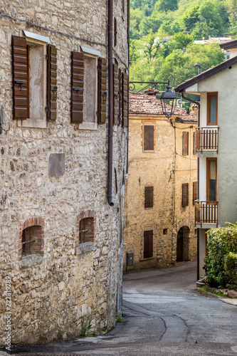 Valdobbiadene region of Prosecco sparkling wine, vineyards planted with steep slopes of hills. Combai village, Italy