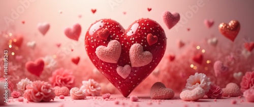 Valentine, big pink heart with flowers on blurry background. Valentine's Day concept