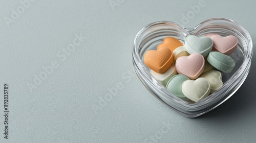 Valentine candy Colorful heart-shaped candies in a clear glass container on a soft background.
