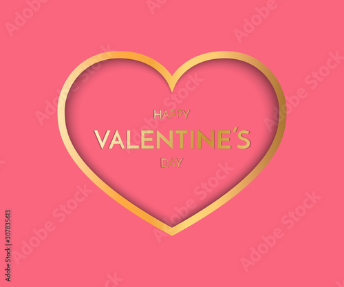 Valentine Day greeting card. Festive Card for Happy Valentine s Day. Pink Background with golden Heart. Symbol of love. Vector Illustration