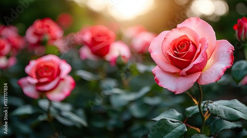 Valentine rose idea. Vibrant pink roses blooming in a garden, illuminated by warm sunlight.