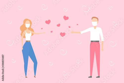 valentine, day, 2021, poster, banner, love, february 14, face mask, quarantine, pandemic, epidemic, cartoon, illustration, vector, concept, date, people, man, woman, nubes, boyfriend, girlfriend, couple, romance, romantic, human relationships, lover, background, card