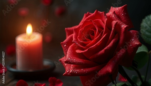 Valentine's Day, a close-up of a red rose with dew drops on the petals, soft lighting from a nearby candle, dark background. AI Generated