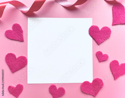 Valentine's day background. Frame from pink hearts on a pink background and white blank card. Love concept. Flat lay, copy space. Card .