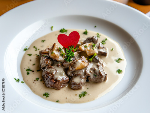 Valentine’s Day Beef Stroganoff: Traditional Beef Stroganoff with Creamy Mushroom Sauce Garnished with Parsley, Romantic Dinner Cuisine