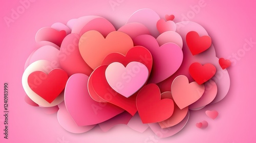 Valentine's Day card with hearts paper cut style on a pink background.