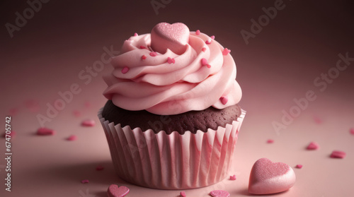 Valentine's Day, chocolate cupcake decorated with pink cream and hearts, romantic sweets