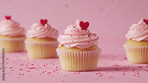 Valentine's Day cupcakes with pink frosting and heart sprinkles on a pink background.