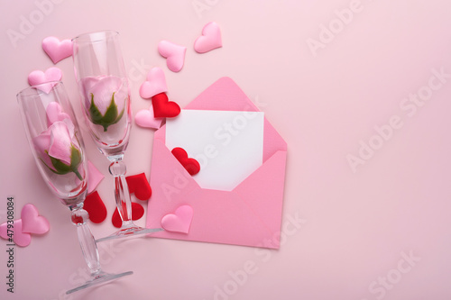 Valentines day greeting card with champagne bottle, gift box, red ribbon and envelope with blank note mockup inside on pink background. Top view with space for greetings. Greeting card with copy space
