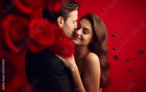 Valentine's day, Heterosexual couple in love hugging, red rose blur background.