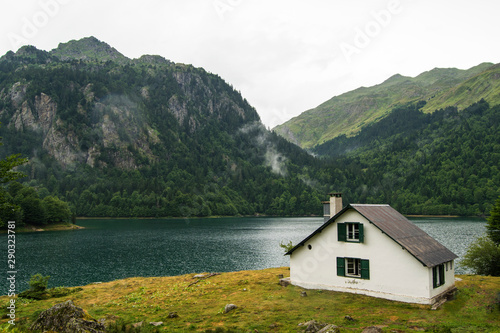 house, landscape, mountain, lake, nature, heaven, water, summer, green, forest, view, view, grass, village, alps, cloud, hill, norge, building, europa, travel, glen, blue, pyrenées, france, mountain, hiking