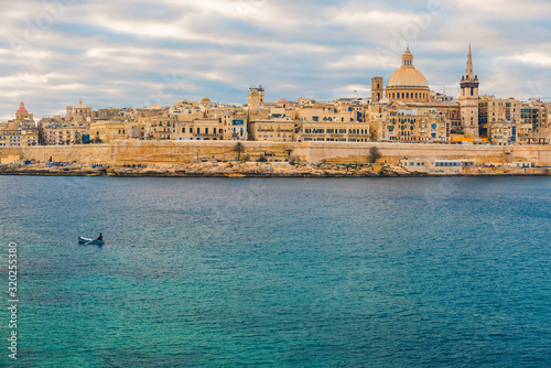 Valletta old town skyline with fisherman in a boat in harbor during sunrise. Malta