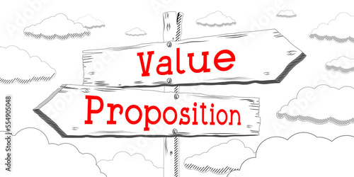value, proposition, deal, investment, business, signpost, crossroad, guidepost, signs, 2, arrow, direction, cloud, pointer, sky, outline, cartoon, wooden, text, word, concept, white background, drawing, vignetting, red, illustration