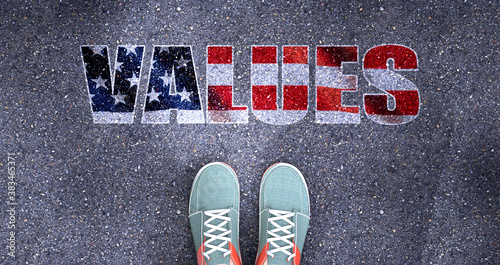 Values and politics in the USA, symbolized as a person standing in front of the phrase Values Values is related to politics and each person's choice, 3d illustration