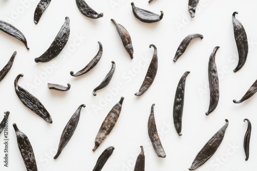 Vanilla beans spread elegantly on a clean white surface capturing natural beauty and rich texture