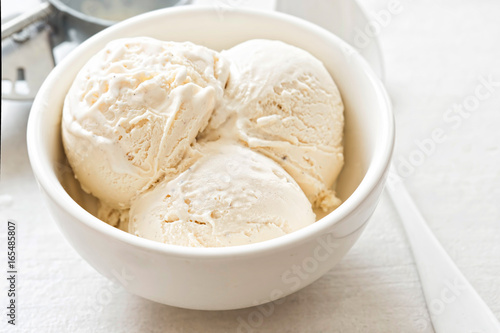 Vanilla ice cream scoops in white bowl