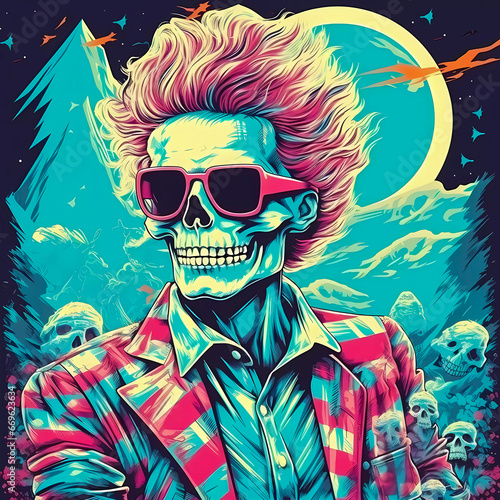 Vaporwave poster of skeleton with nicely done hair, Generative AI