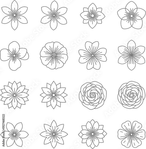 floral, line, art, design, black, white, variation, flower petals, symmetric, intricate, simple, complex, layered, center, grid, pattern, empty, space, contrast, outline, arranged, illustration, harmonious, composition, geometric, organic, minimalist, detailed