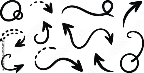 arrow, pointer, direction, symbol, graphic, design, element, set, collection, curved, straight, pointing, left, right, up, down, swirl, loop, dotted, line, isolated, white background, hand-drawn, vignetting, doodle, navigation, information, communication, abstract, art