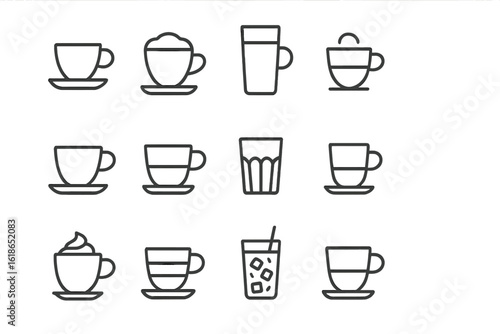 Variety of coffee cup and glass icons on gray background