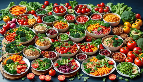 Variety of fresh fruits, vegetables, and grains arranged in a visually appealing pattern on a black background. Diversity and abundance of healthy food options