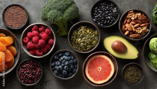 food, healthy, diet, nourishment, fruit, vegetable, broccoli, avocado, berry, nut, seed, pumpkin, grapefruit, apricot, bean, ingredient, raw, fresh, still life, overhead, table, health, wellness, lifestyle, vegan, vegetarian, vitamin, antioxidant, fiber, organic, cooking, eating, dark, background, bowl, group, arrangement, culinary