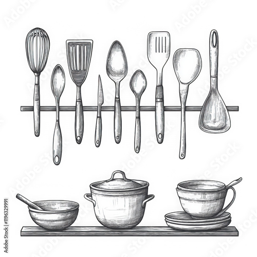 kitchen, utensil, hanging, hook, shelf, spatula, whipped, ladle, spoon, bowl, pot, cookware, tool, cooking, preparation, design, modern, black, white, minimalist, home, interior, decor, functional, organise, food, chef, bake, meal, art, vignetting, illustration, kitchen utensile, wooden, metal, storage, rustic, clean, simple, stylish, handy, practical, equipment, culinary, serve, arrangement, display