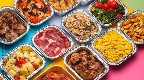 Variety of nutritious prepared meals presented in convenient aluminum containers