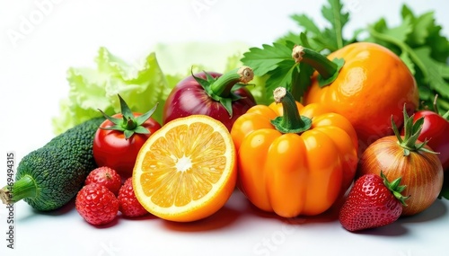 Variety of organic fruits & vegetables isolated, ripe, healthy