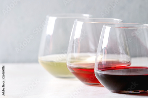 Variety of wine. Red, rose and white wine in old fashion glasses in row on white marble table. Copy space