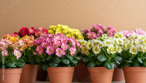 Various beautiful Kalanchoe flowers in pots on blurred beige background, close-up