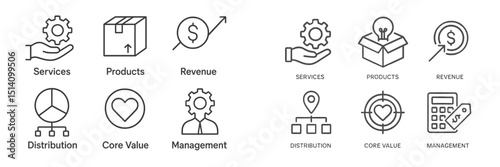 Various business icons representing services, products, revenue, distribution, core values, and management concepts for a professional setting