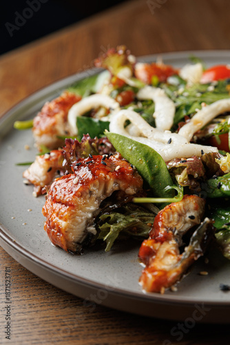 dish, food, salad, fish, vegetable, plate, meal, grill, serve, arrange, cookery, eat, fresh, greener, tomatoes, garlic, seafood, sesame, taste, healthy, garnish, cook, dining, lunch, japanese, ukrainian, favor, receipe, enjoy, bite, presentation, local, market, epicure, catering, eatery, kitchen, seasonal, ingredient, artisan, style, plating, life events, culinary