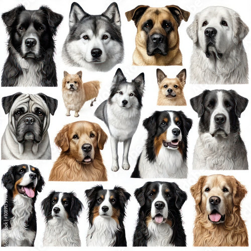 Various dog breeds with distinct features and expressions, showcasing their unique personalities and characteristics. This collection highlights diversity and charm of these beloved pets