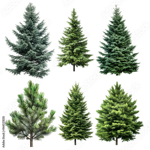 Various evergreen trees displayed on a transparent background for educational and design purposes in natural settings