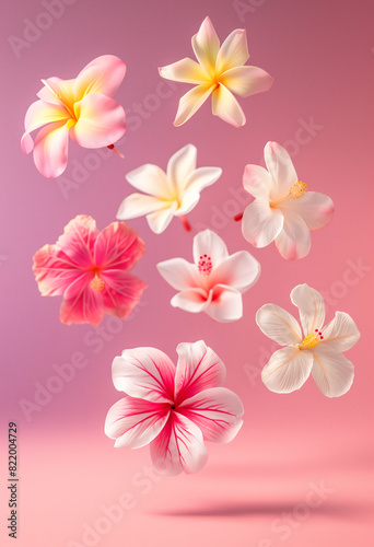 Various exotic flowers with floating petals on a pink background. Featuring plumeria, pink frangipani and hibiscus.
