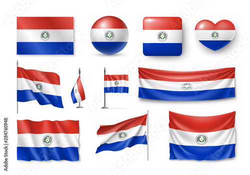 Various flags of Paraguay independent country set. Realistic waving national flag on pole, table flag and different shapes badges. Patriotic paraguayan rendering symbols isolated vector illustration.