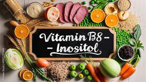 Various fresh food vegetables, fruits, with the sign inscription vitamin B8 Inositol