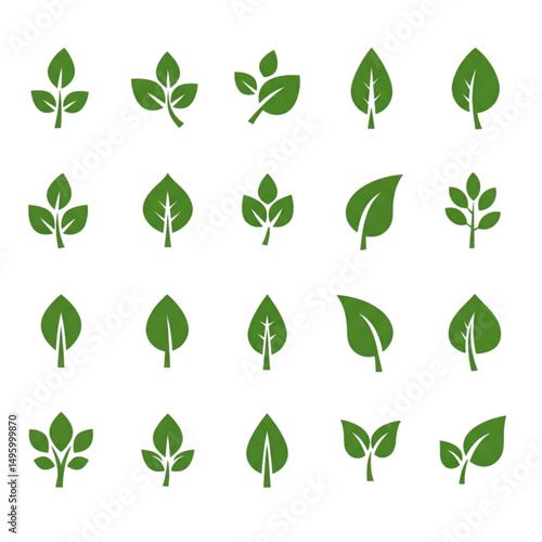 Various green leaf icons in different shapes. A collection of simple nature themed design elements
