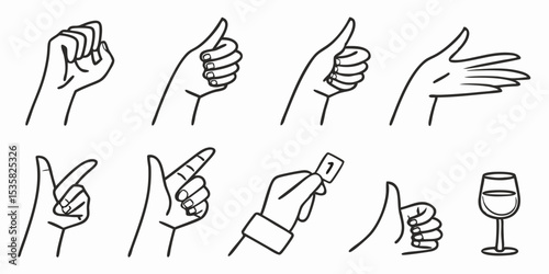 Various hand gestures and a wine glass outlined in black offering versatile design elements suitable for creative projects