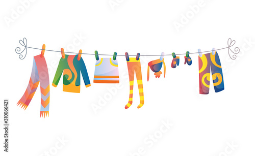 Various items of baby clothes on rope isolated vector illustration on white background. Laundry held by plastic pegs drying