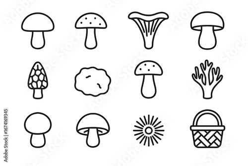 mushroom, fungal, icon, basket, illustration, nature, plant, collection, black, white, outline, design, different, shape, simple, variety, unique, vignetting, diverse, species, set, artistic, natural, organic, decorative, graphic, edible, botanical, minimalistic, stylised, forest, wild, vector, icon