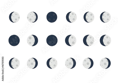 Various phases of the moon displayed in a grid format, showcasing celestial beauty, isolated on white background