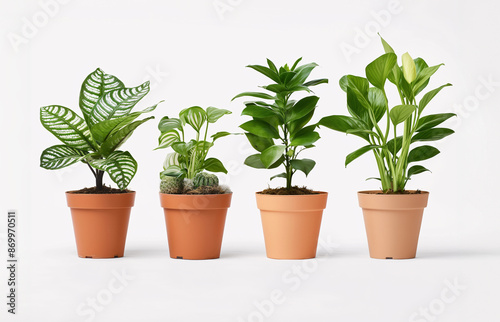 Various potted houseplants in different pots on a white background.