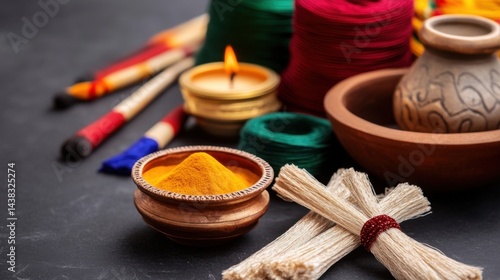 Various sacred threads (raksha sutra) arranged with Diwali puja items. Symbolic representation.