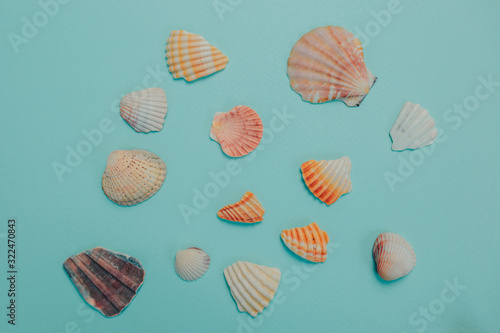 Various seashells on blue background. Summer time card with sea shells and copy space.