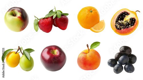 Various summer citrus exotic sweet organic fresh healthy fruits including apple, orange, strawberry, grapes, pomegranate and mango isolated on transparent background. Set, collection