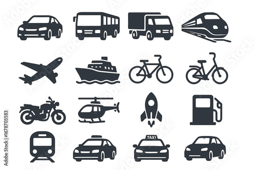 transportation, icon, car, train, bicycle, aircraft, boat, vehicle, travel, commute, bus, motorcycle, helicopter, rocket, gasoline, station, ship, mobility, public, private, taxi, urban, city, transport, cycle, aeroplane, scooter, infrastructure, journey, movement, vector, icon