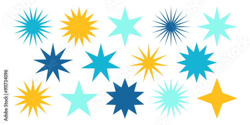 Various Yellow blue stars collection. Sunburst Starburst icon collection. Geometric star shape sticker. Simple circle badge stamp. Decorative Element for design