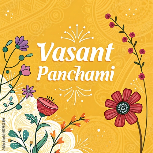 Vasant Panchami greeting card with floral designs and text on Saraswati, Puja, Poster, Banner, Post, Story,